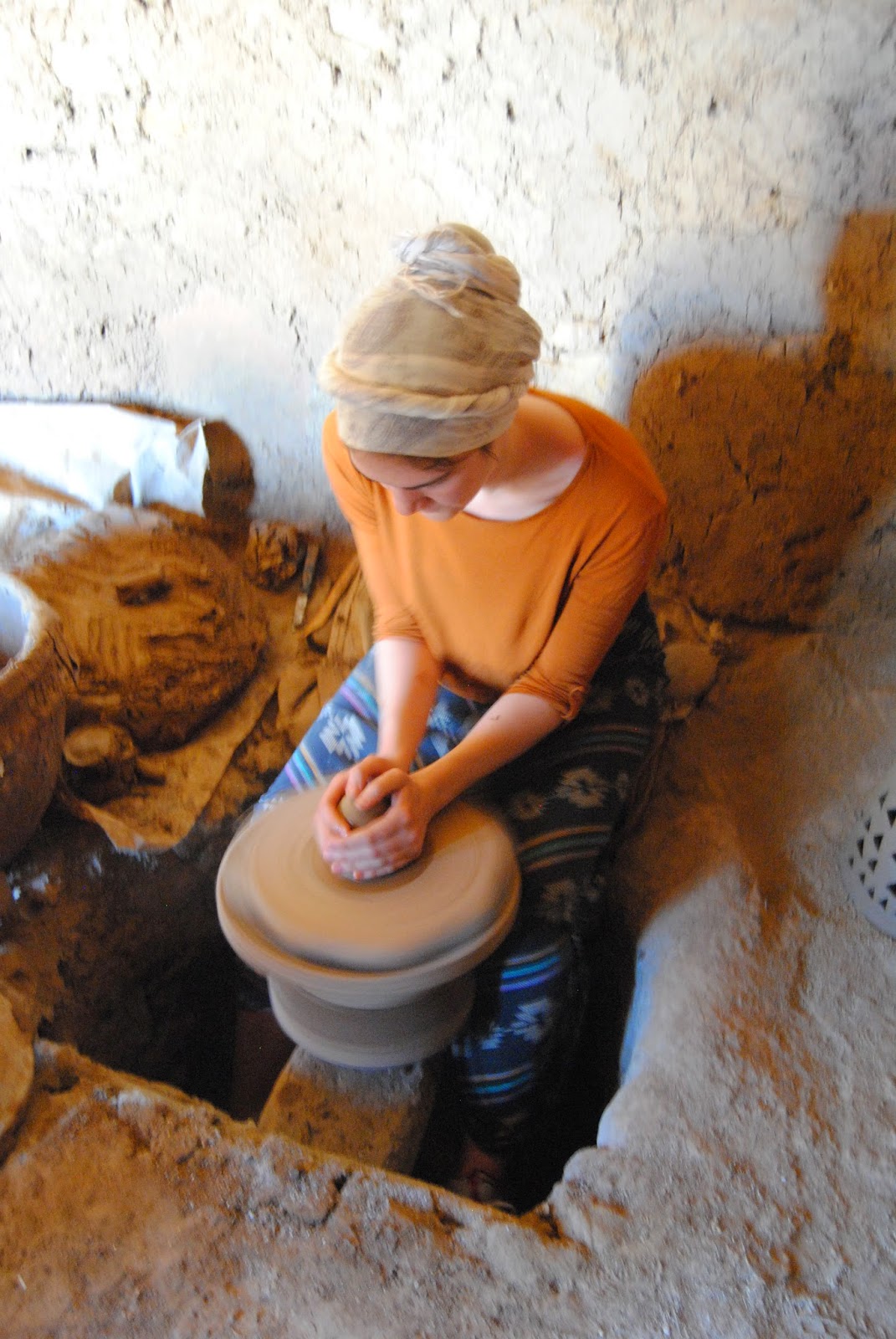 I told Dounia (from La Maison Anglaise- where we were staying) that I had taken a pottery class this past semester at home. She must have told one of the men on the wheel because he got up and offered me a chance to try throwing. I sat at the wheel and gave it a shot! The wheel did not need to spin as fast as I first thought, it was quite different from what I am used to. I started to throw a mug, but it was very uneven because I was unsure how to center the clay on this style of wheel. After my sad attempt, I got off the wheel and the man managed to throw a perfect mug in all of two minutes.